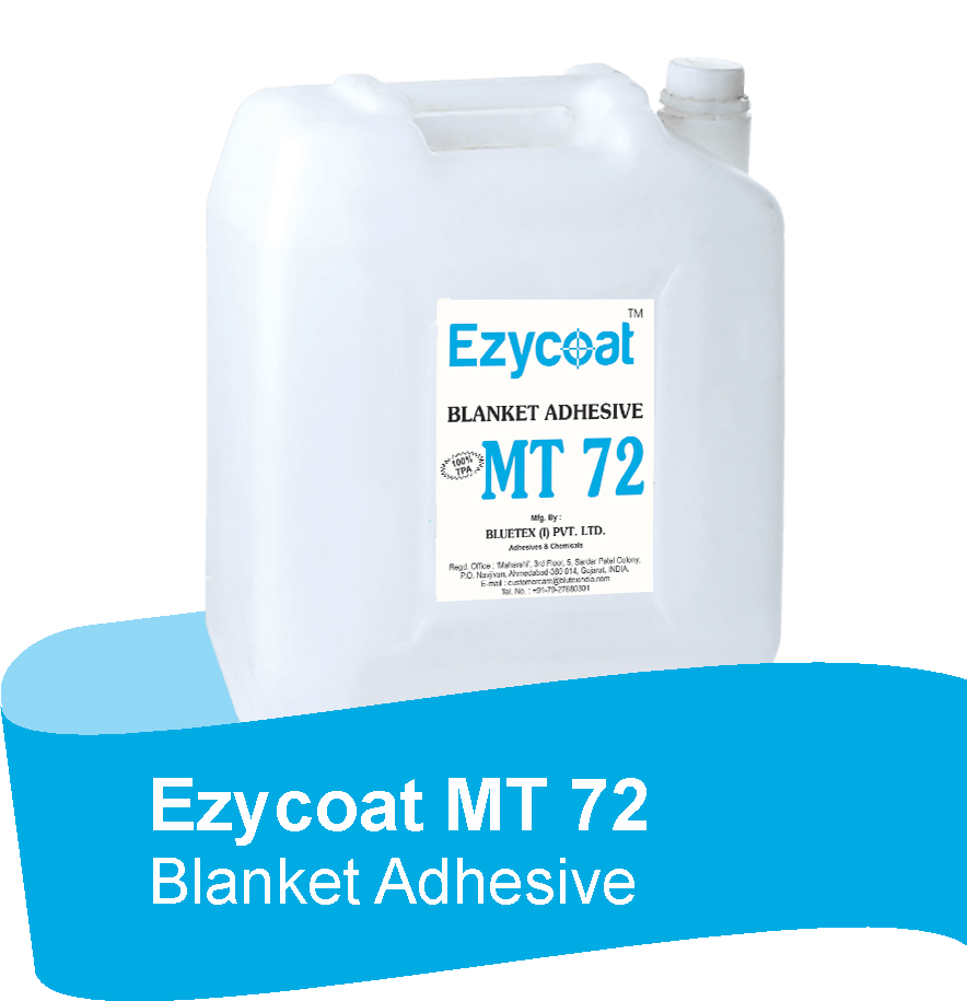 Bluetex – MT 72 is colourless, liquid thermoplastic based blanket adhesive for the safe adhesion of fabric on the rubber/PU blanket of flatbed printing machine. The adhesive gives tackiness at a particular temperature.
